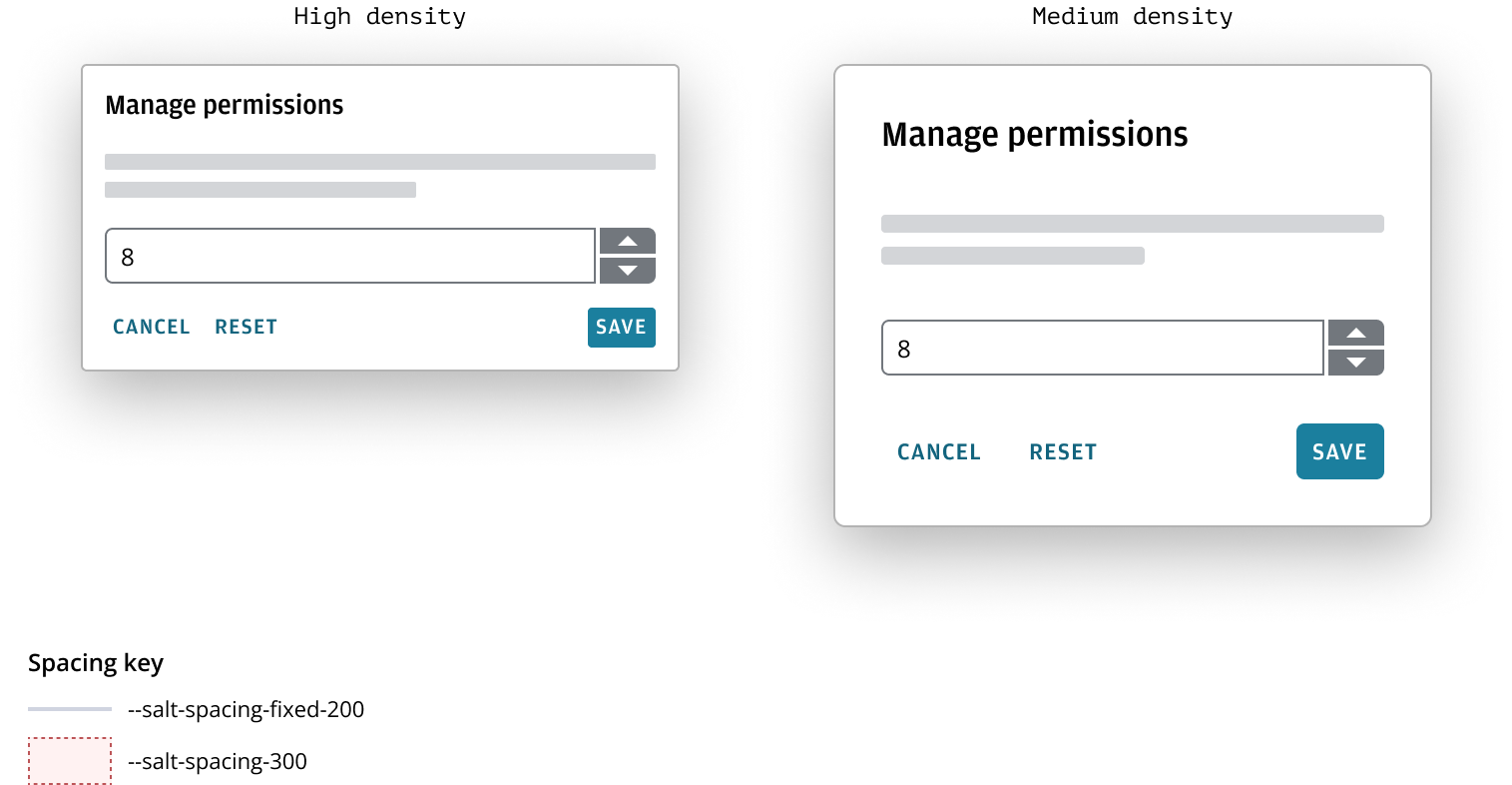 The Salt spacing system is built on a base unit of --salt-spacing-100 for each density, with a proportional scale across all densities. Each space token is a multiple of --salt-spacing-100 and percentages of the base unit. This scale ensures consistency and flexibility with values that adjust predictably.